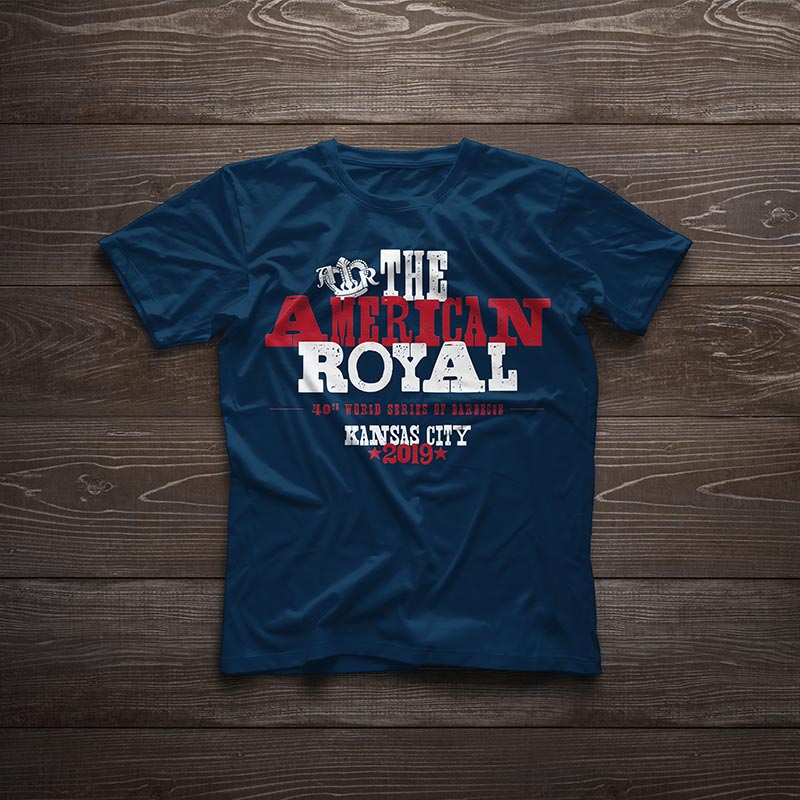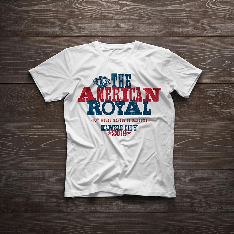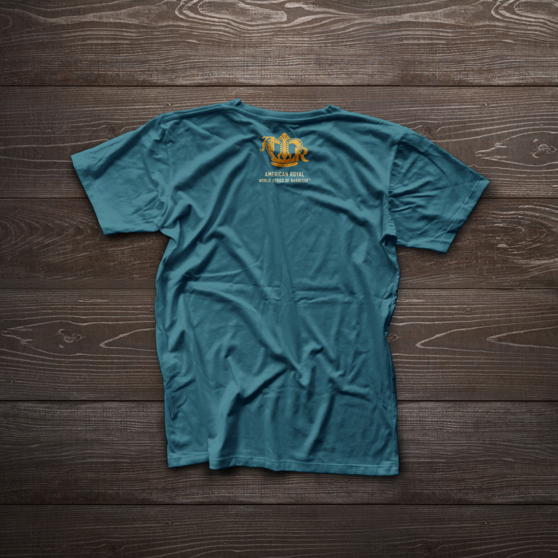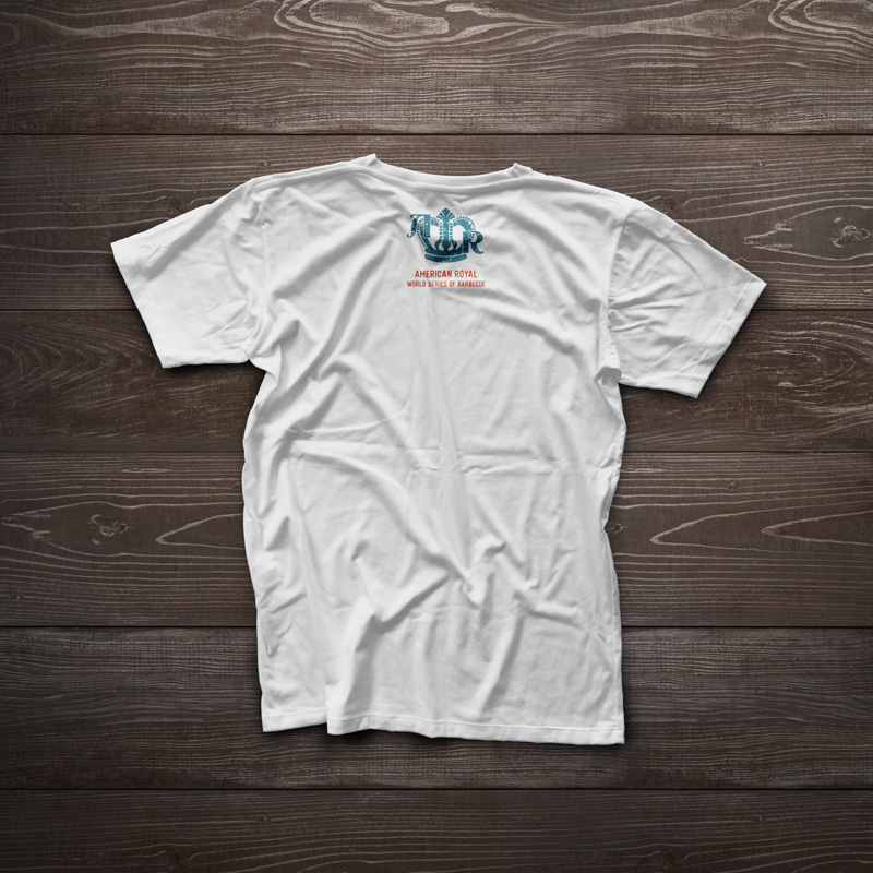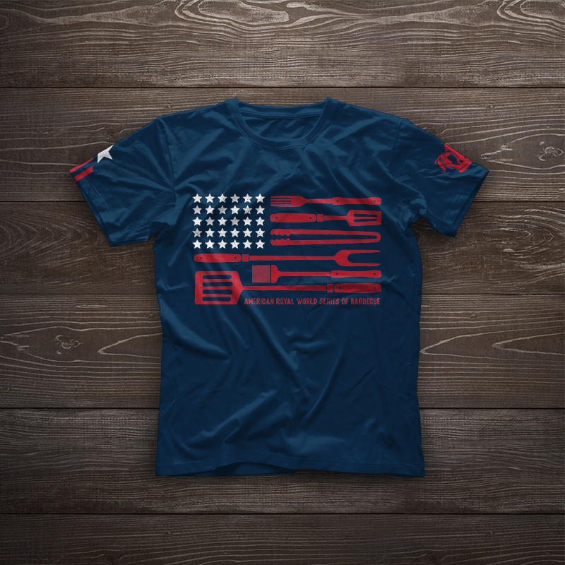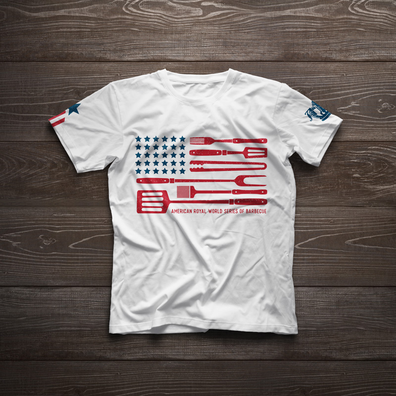 On the Saturday of the competition, there was a special military appreciation event. American Royal wanted a military/patriotic t-shirt design, so I came up with an american flag design that substituted barbecue tools for the stripes of the flag. The back features the event name and sponsor, and the sleeves feature the American Royal logo and a service stripe-styled graphic.