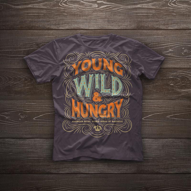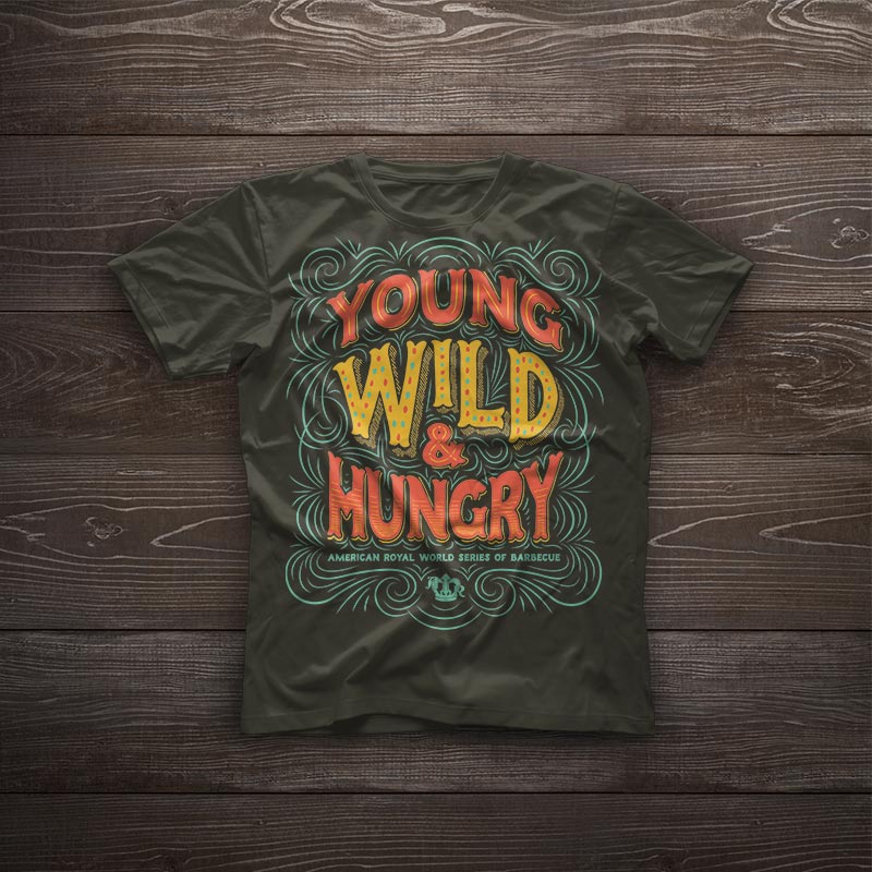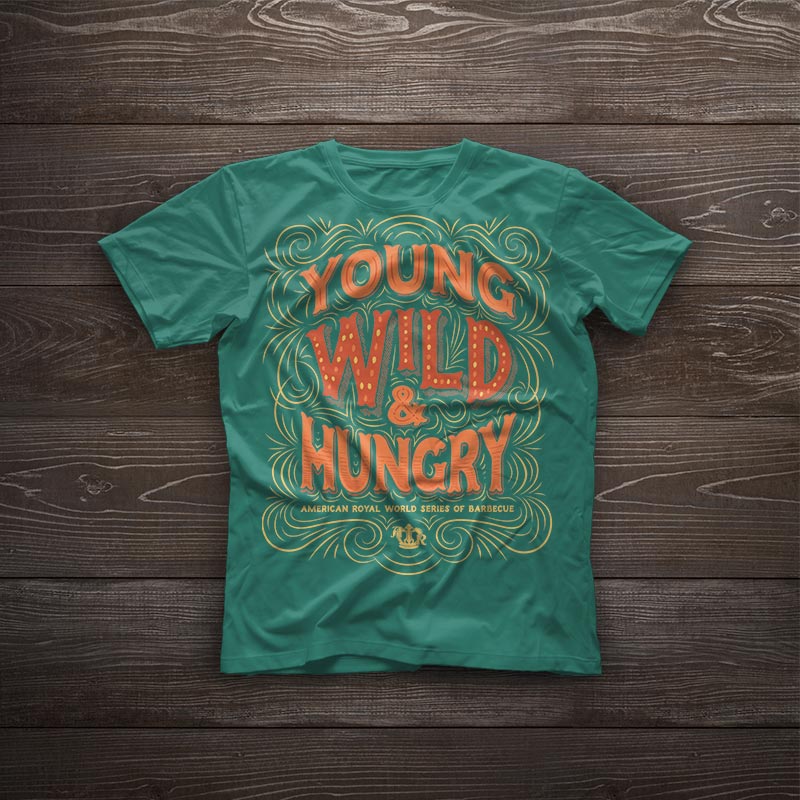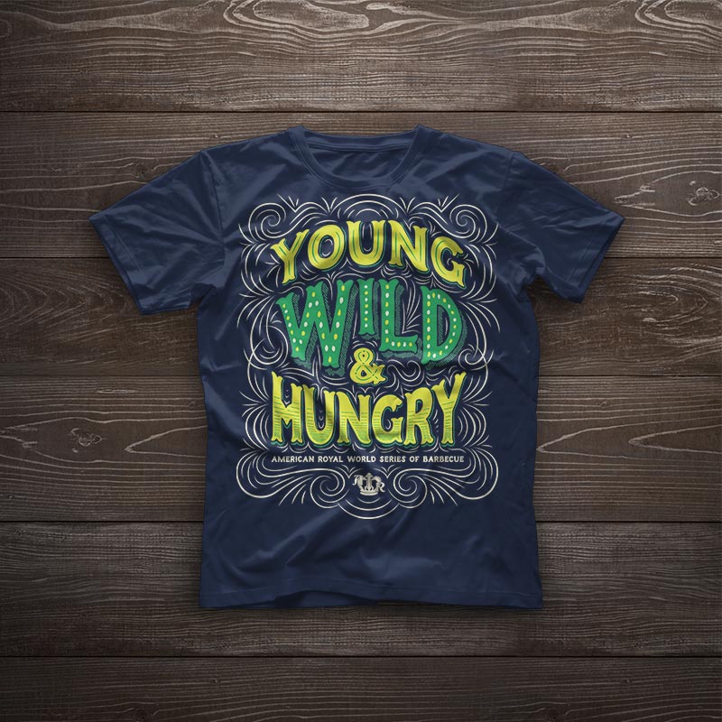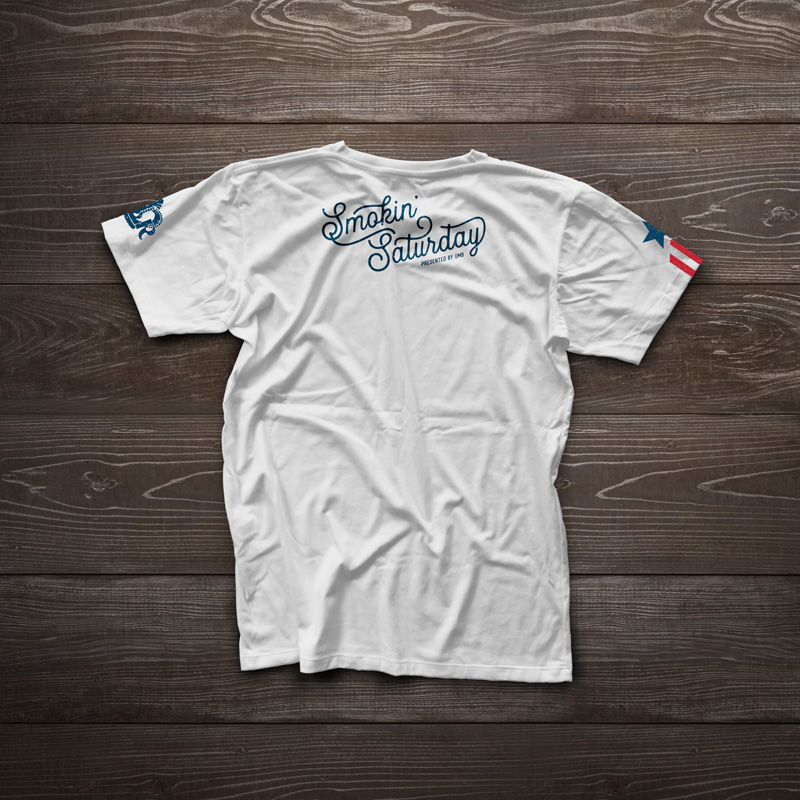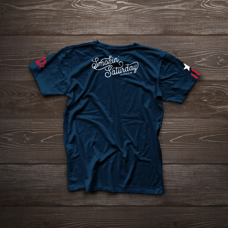 On the Saturday of the competition, there was a special military appreciation event. American Royal wanted a military/patriotic t-shirt design, so I came up with an american flag design that substituted barbecue tools for the stripes of the flag. The back features the event name and sponsor, and the sleeves feature the American Royal logo and a service stripe-styled graphic.