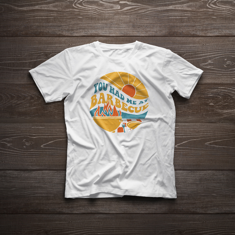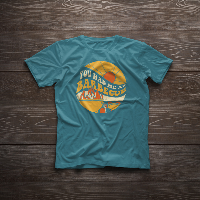 For the teen shirt, my teammate and I had noted the rising popularity of 1970s graphics. I designed a scene with an open grill, a picnic table setting, and sunshine, with the playful slogan: “You had me at barbecue”. I chose a retro color palette and used a typeface with fat letterforms reminiscent of 1970s typography.