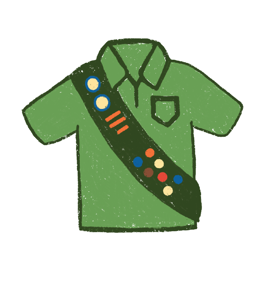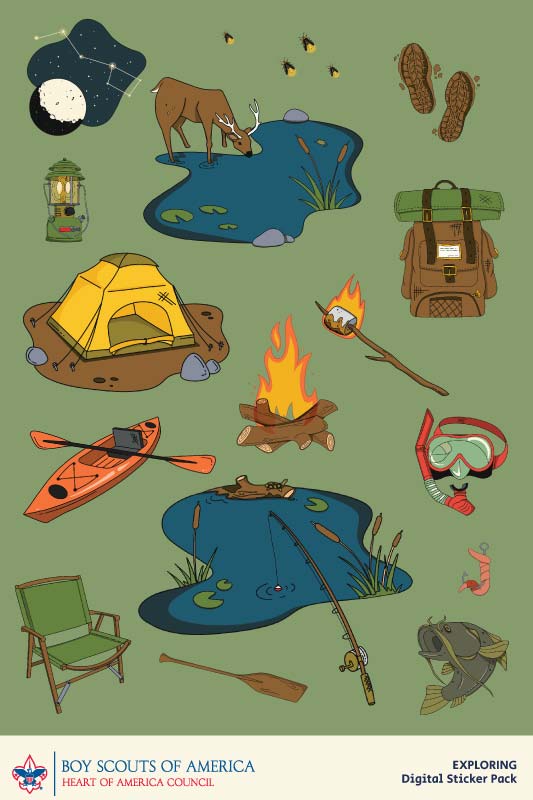 Part of the lead art director’s original plan was to illustrate stickers to send in the mailed component of the report, but budget restrictions and pandemic conditions led us to change our strategy– we began to think in digital terms, primarily the social media that members of Scouting were likely to use, Facebook and Instagram. We enlisted a junior art director from our creative team and each of us illustrated an entire sticker pack in a style of our own choosing, but using the same color palette. These stickers were scout themes, but we illustrated them with the purpose of being used digitally, in social media stories and posts.