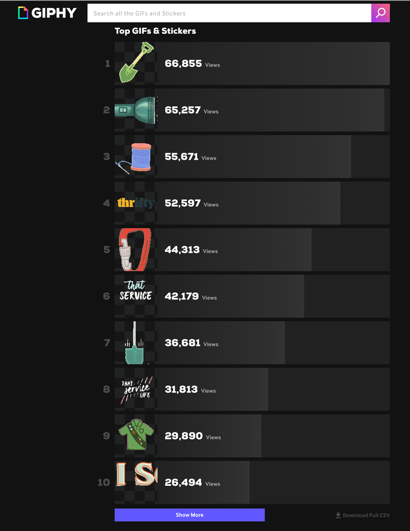 The stickers were very well received by the Scouting community, some gaining as many as 66,855 views in the first two weeks of being published on the new Giphy.com brand channel. The Giphy.com account I created for the Boy Scouts has 1.8 million views to date.