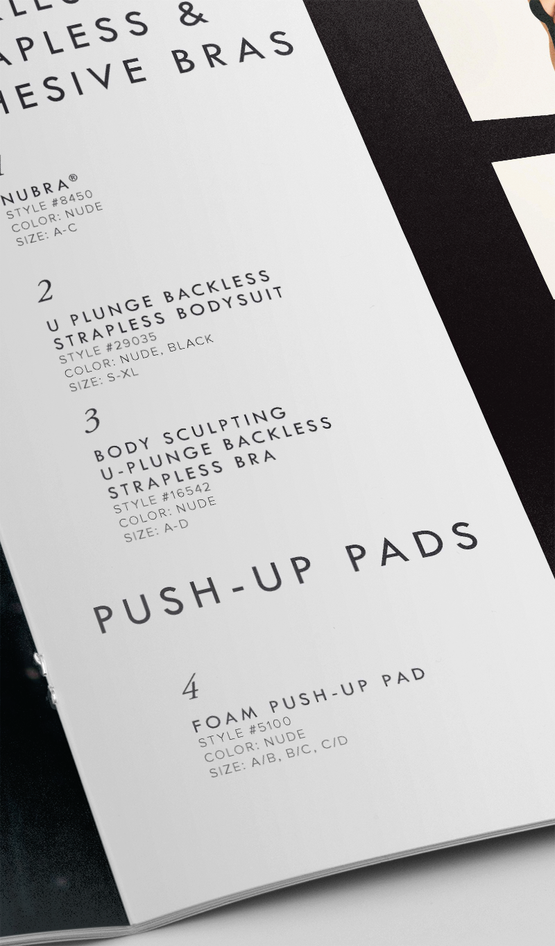 This is a complete catalog design of all the products offered at Fashion Forms, created to be an asset for the sales team and for trade shows.