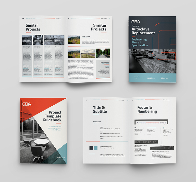 To accompany the Project Proposal Template, we created a Guidebook to instruct each GBA office on how to use our template autonomously yet stay on-brand. The Guidebook has information on everything from fonts, colors, footers and margins to guidelines for photography usage, callouts, and even specifications on printing and binding materials.