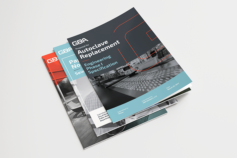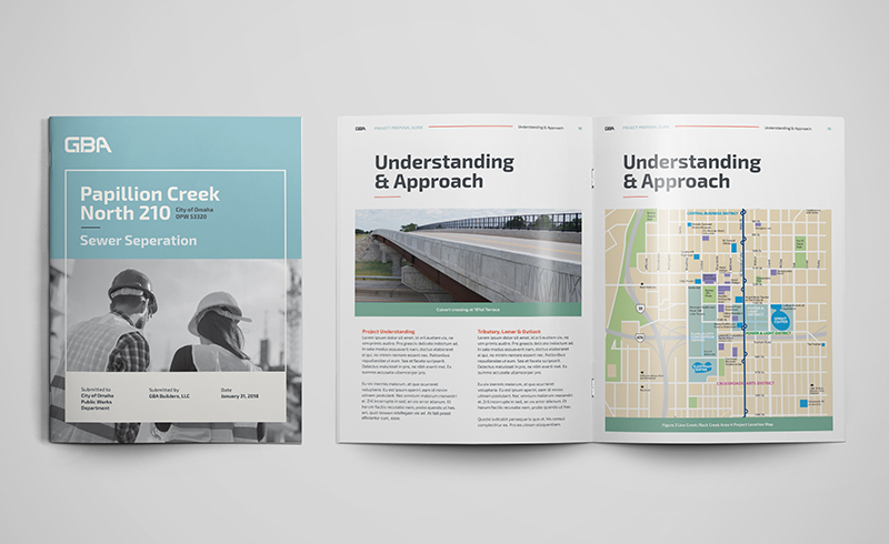 This 48 page Project Proposal Template was created for George Butler Associates, a Kansas City-based Engineering Firm. This firm has multiple offices, and each were generating their own project proposals, using disparate fonts, colors, and even programs to which caused a lot of inconsistency in their branding.
