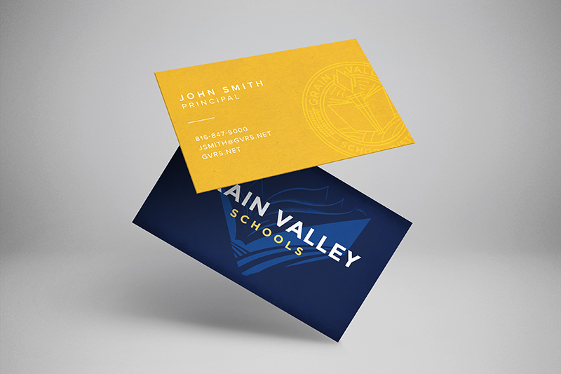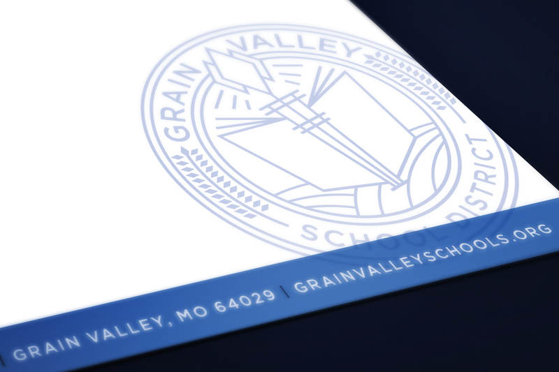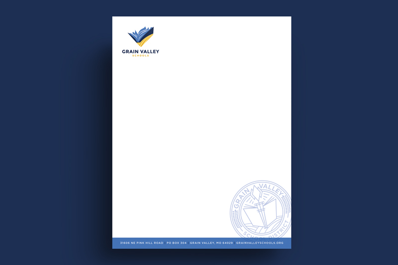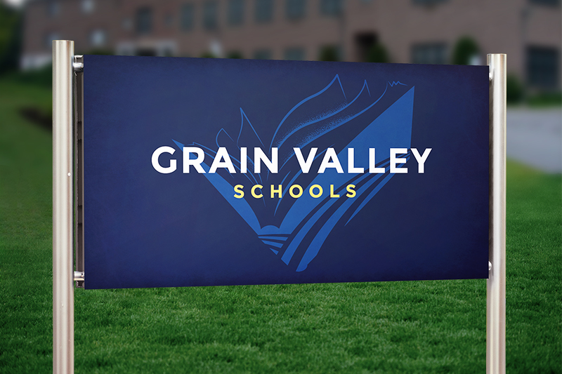 This project came on the heels of my agency’s new logo design for Grain Valley School District, located in Grain Valley, Missouri. With the new logo, fonts, and brand colors chosen, I was tasked to design collateral for the schools, including business cards, letterhead, email newsletter, name badges, polo shirts, and signs for the school district.