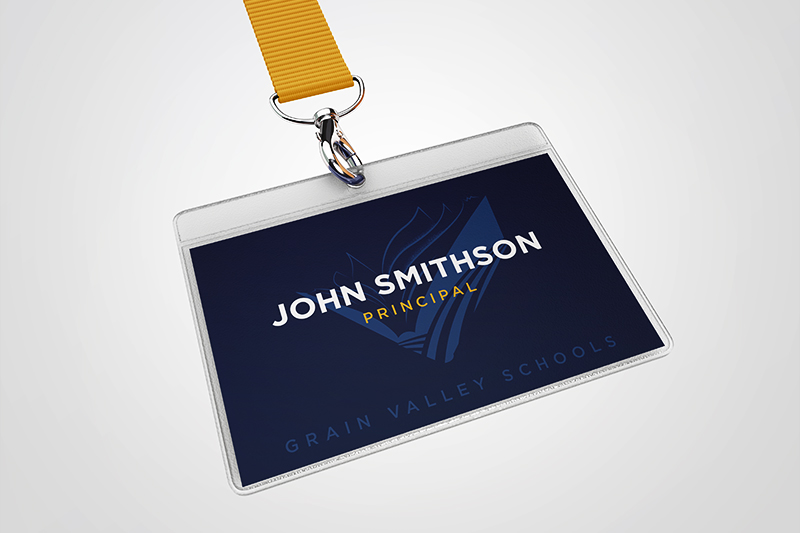 Featured on a woven gold lanyard, these nametags feature the new icon in a subtle tone-on-tone with the individual’s name and their job title as the focus, and includes a subtle “Grain Valley Schools” at the bottom.