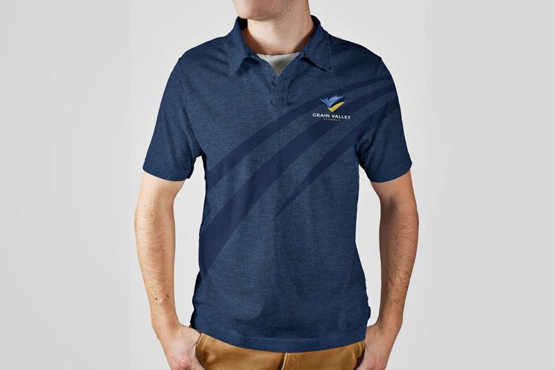 Grain Valley requested a polo shirt with their new branding. In addition to the traditional logo on the breast, I also pulled the stripes out of the hill in the logo and used them in a subtle and abstract way to make the polo stand out a little more. The logo on the breast is embroidered, while the abstract stripes are printed.