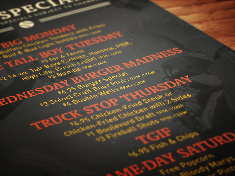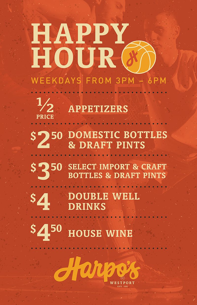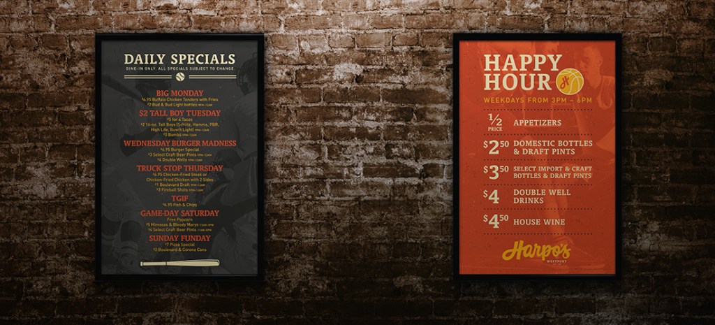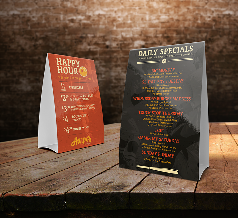 Harpo’s KC, located in the Westport entertainment district, wanted some new designs for their Happy Hour and Daily Specials- menus, posters, and table tents.