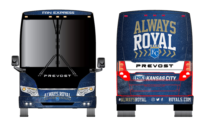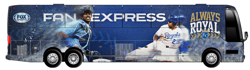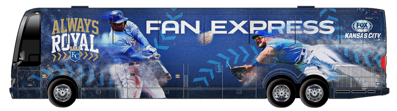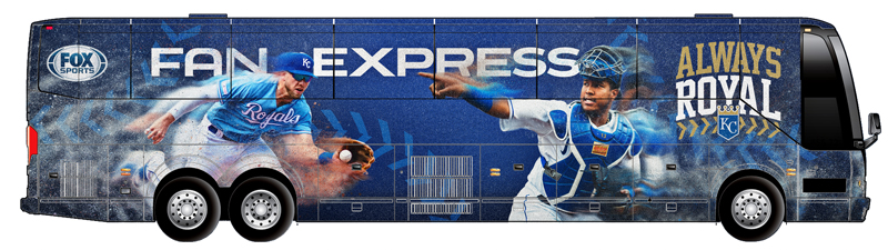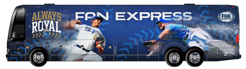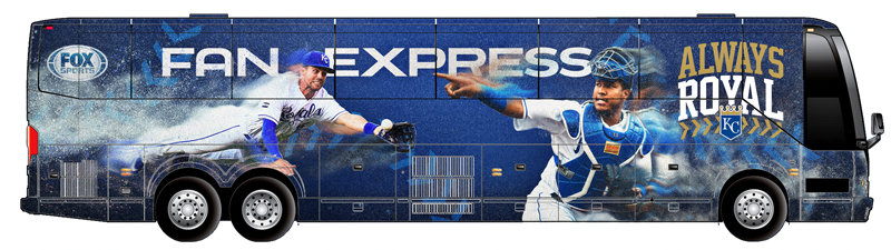 In addition to the players, I needed to include some other elements in the wrap – including the year’s tagline, “Always Royal”, abstract marks that represent the stitches in a baseball, “Fan Express,” so the fans would recognize the bus, Fox Sports KC logo, and a background of Royals blue.
