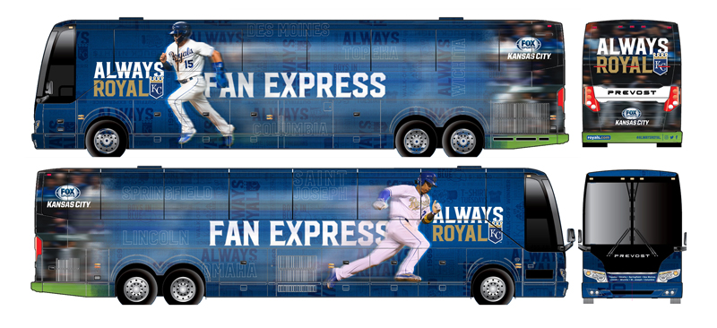 While at Walz Tetrick Advertising, I art directed and designed the Fan Express Bus vinyl wrap for the Kansas City Royals Major League Baseball team. The Royals Fan Express is a bus + program that gives fans in the Midwest region the opportunity to win a trip to Kansas City to see a Royals game in person. Each Royals Fan Express Pass includes travel to and from KC on the Royals Fan Express bus, a ticket to that day’s game, and a game program. Two weeks prior to each Royals Fan Express trip tune into our respective radio partner to learn more about contest details. The bus travels as far south as Springfield, MO, or Wichita, KS, and as far north as Omaha, NE to pick up Royals fans and bring them to the game.