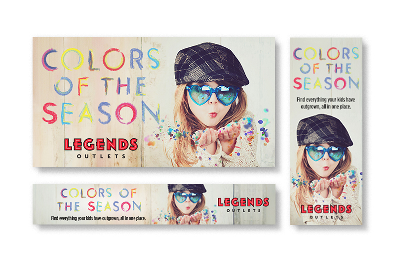 This project was a Spring/Easter campaign I designed for Legends Outlets to feature their children’s stores during March & April. I wanted to incorporate the spring colors and a fun and family-friendly sense of fashion without being too snobby. The crayon treatment of the title was a fun and colorful solution for child-like but readable typography in the usual brand font.