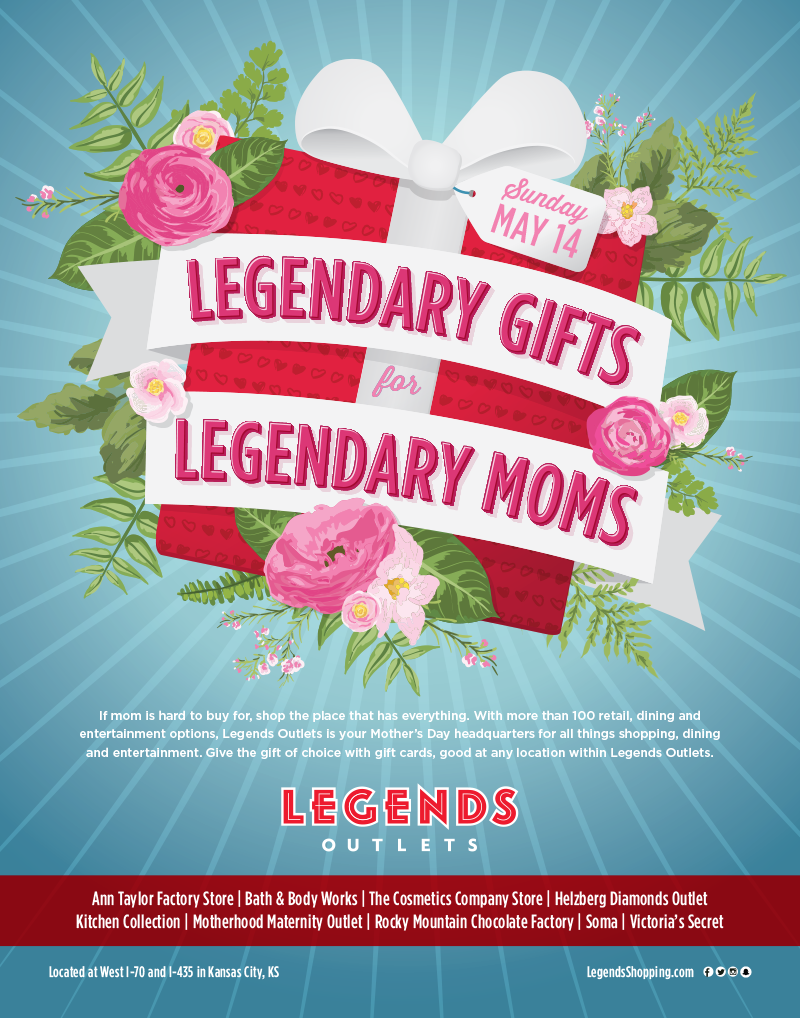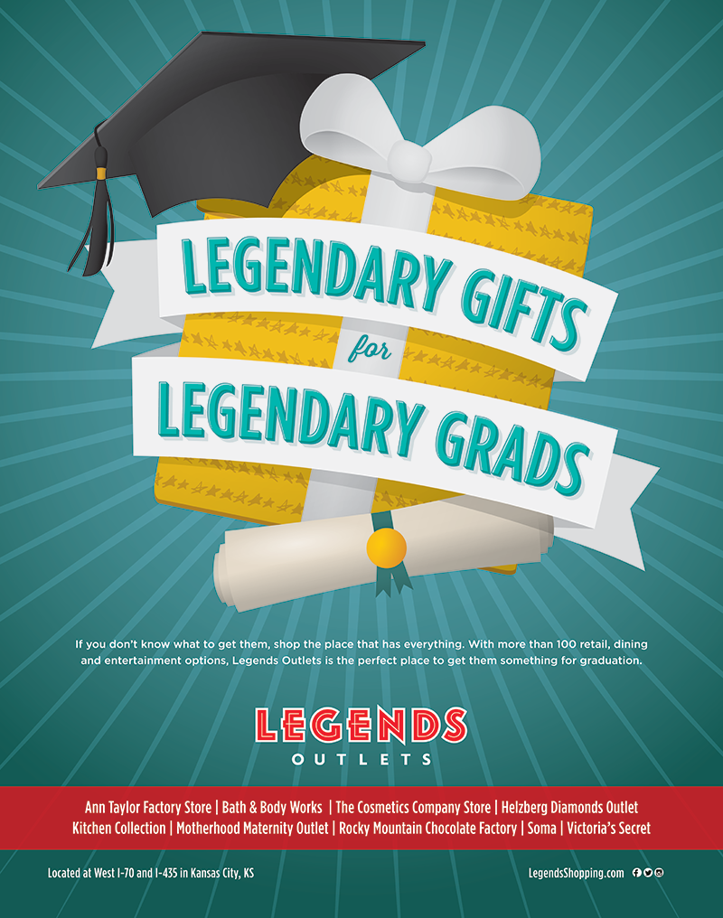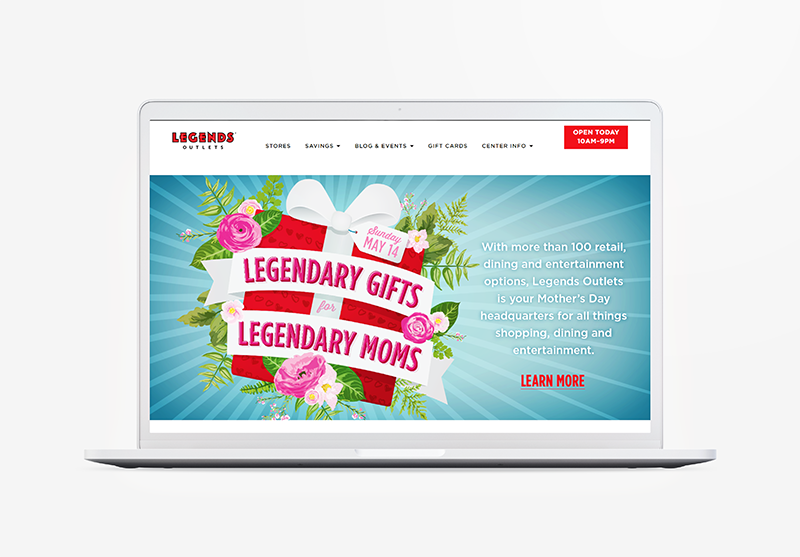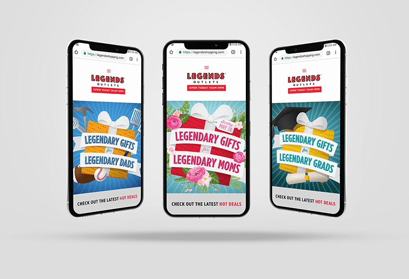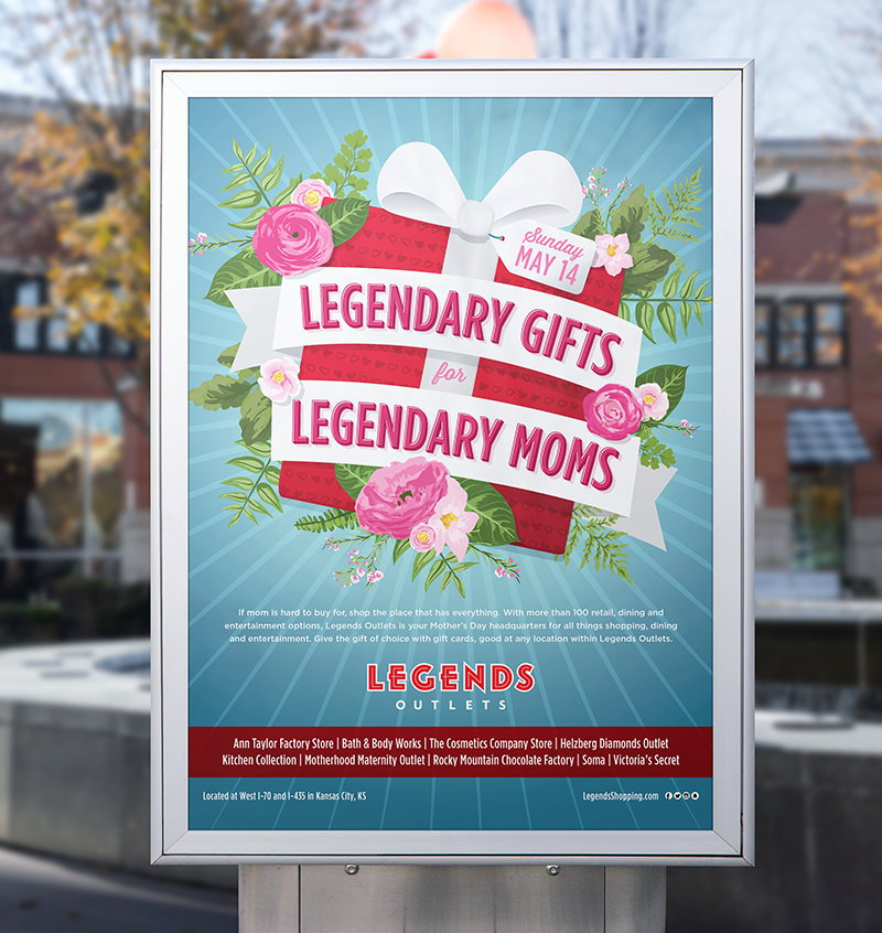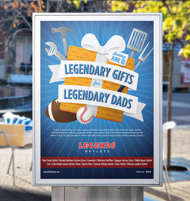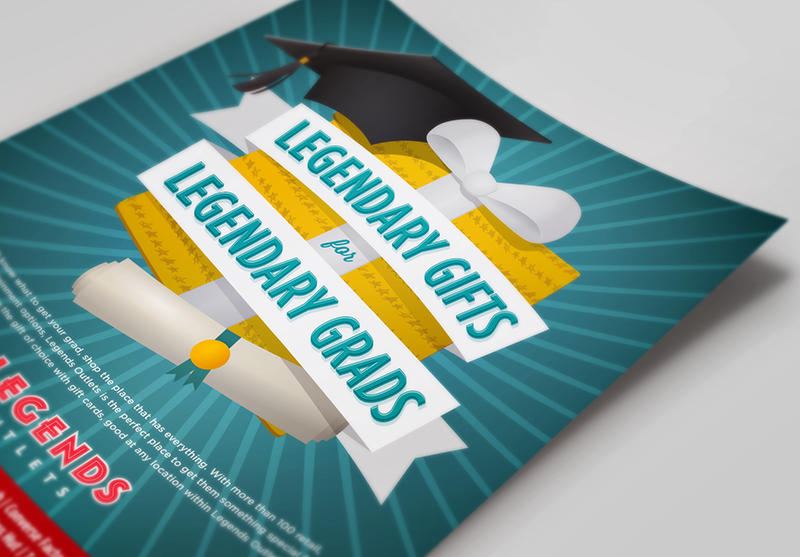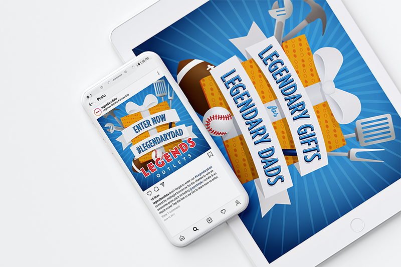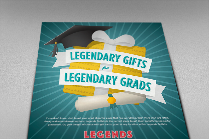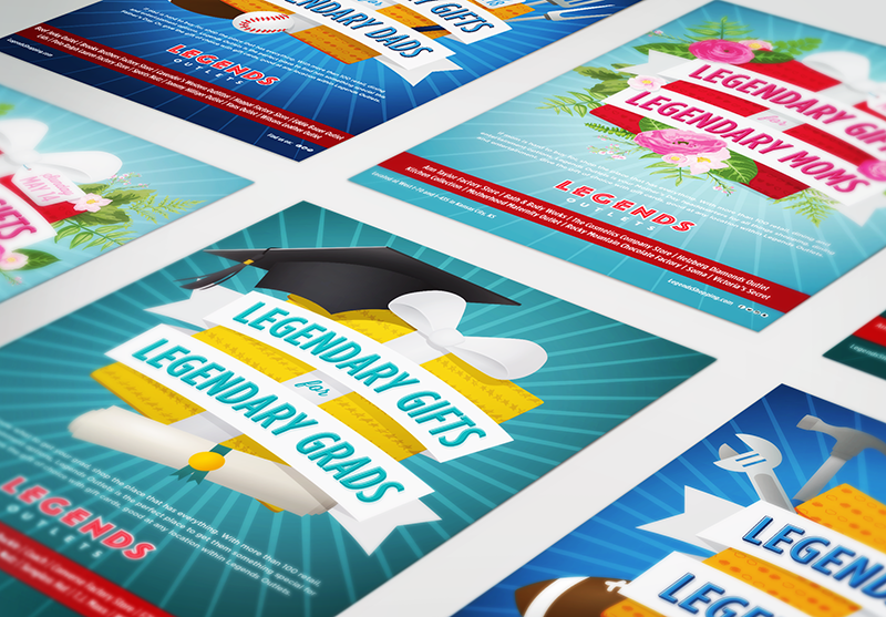 The Legendary Gifts campaign for Legends Outlets was a bright, illustrative campaign including print and digital ads, signs, and social media assets for Mother’s Day, Father’s Day, and celebrating Graduates.