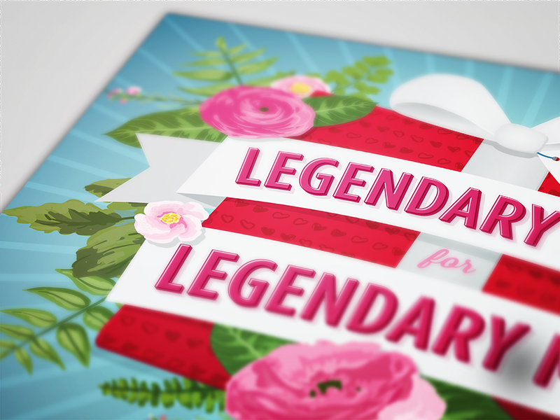 With mothers of all different shapes, colors, sizes, and circumstances to represent, I decided the better option would be to go in an illustrated direction and focus on the gift, with the idea that it might contain something from Legends Outlets. I started by drawing the package and then the flowers. Once I got them finished, I established the layout and the ribbon banner, and lastly the colors.