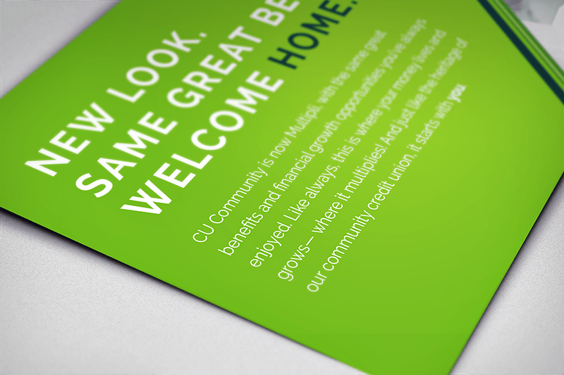 The purpose of this piece was to remind members of the credit union’s recent re-brand and to assure members that the change is only aesthetic. All aspects of this piece were designed according to the new Multipli brand.