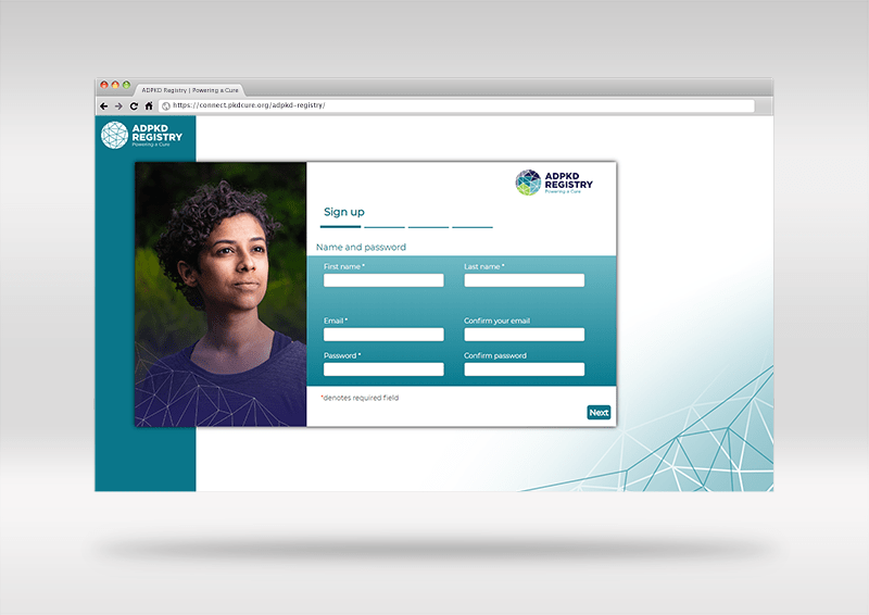 Working together with a developer, I helped create a branded web page for the registry interface, helping the registrants move from the branded PKD Foundation website into the proprietary, protected, private registry portal. In spite of the registry becoming a bit more “vanilla” after the sign-up page (no more imagery or graphics), we maintained the branding throughout with the tranquil turquoise in the backdrop corner fractals, and the brand presence in the top left corner.