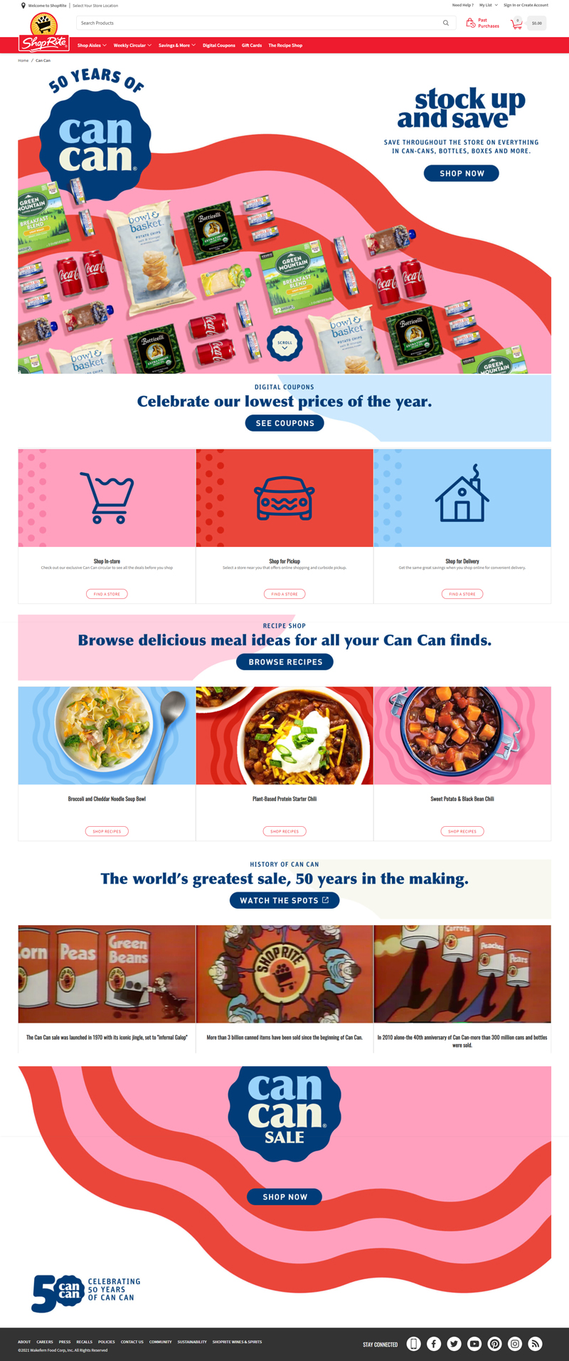 Working with the Brand Manager, we designed a new homepage for the ShopRite website that carried the CanCan Sale campaign design all the way through. I created the hero image with product grid, icons that use elements from the campaign design, and .gifs from the nostalgia/legacy videos to entice clicks.