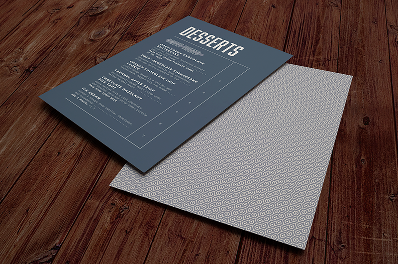 The typography in this menu set is a combination of Abolition, Montserrat, and Courier New. We sourced a “paper” that was actually a type of plastic that had the thickness of a heavy matte paper with the durability to stand up to spills and food splatter.