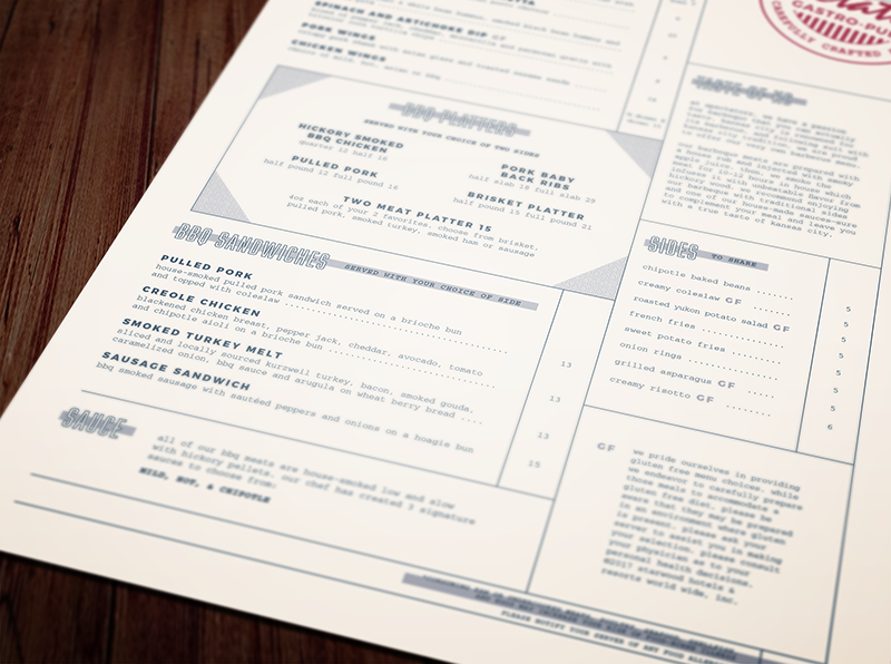 One of the goals of the new menu set was to elevate the restaurant from the look of a sports bar to the classier, more modern feel of a gastro-pub. The original menu was printed on standard tabloid paper, which easily wrinkled and stained.