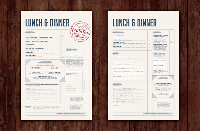 Since Spectators wanted to be re-branded as a gastro-pub, my first inclination was to create a menu that incorporated food photography, but the client didn’t have the budget for photography, so I went with a more sophisticated typography-based design.