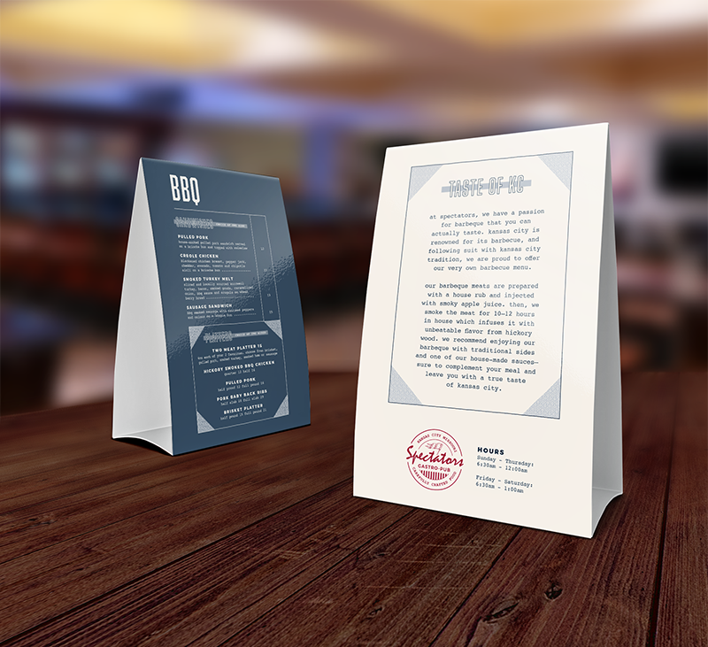 Spectators is a gastro-pub located in the Sheraton Hotel at Crown Center, near downtown Kansas City. This project started with a redesign for the restaurant’s menus, and ended with a sign that advertised the restaurant and directed hotel guests and Crown Center visitors to the restaurant.