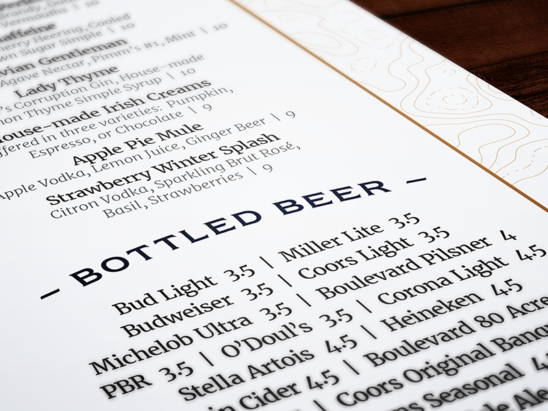 They had just undergone a brand evolution led by the Design Director at Fire Engine Design Studio, which gave me a fresh set of design elements to work with – a redesigned logo and elegant color palette, plus a pair of fonts and the topographical pattern, which had been part of the design concept. I brought in an additional element: the marbled pattern seen in the background of the Happy Hour Menu.