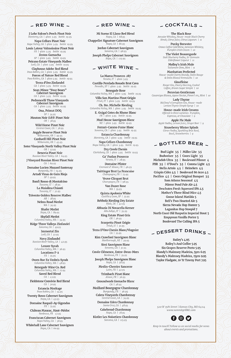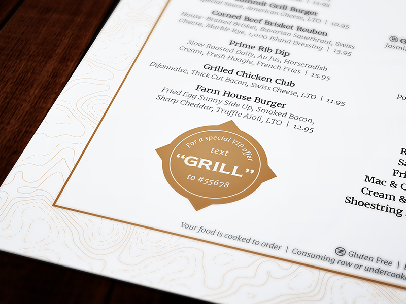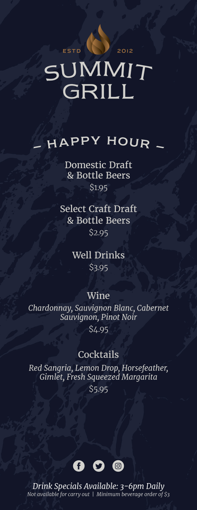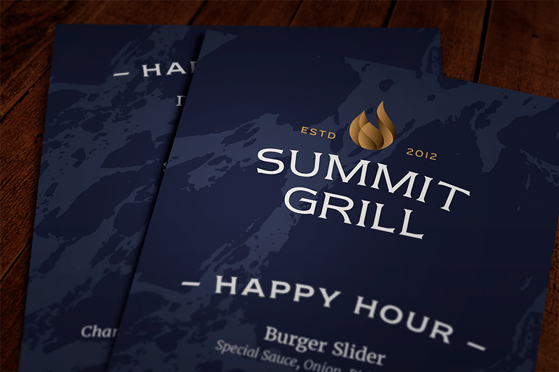 This project was a set of menus for Summit Grill, a restaurant serving ‘classic American fare’ with 3 locations across Kansas City. This client needed a menu for brunch, lunch, dinner, and happy hour, based on their new branding.