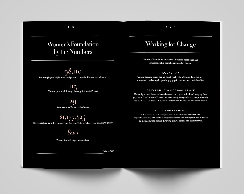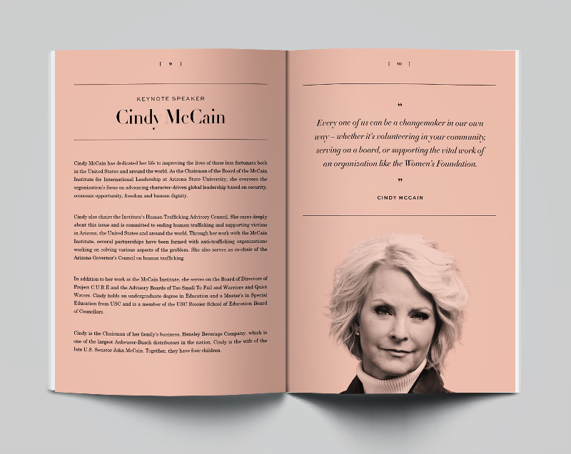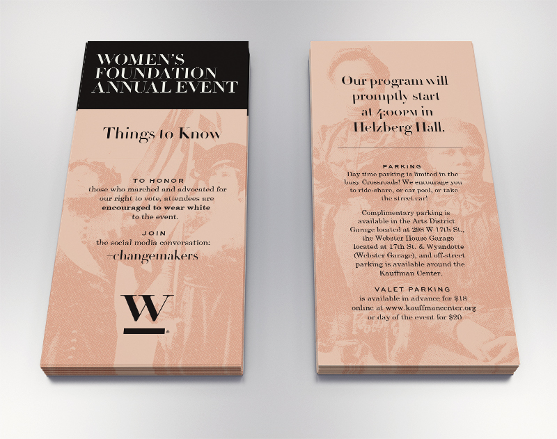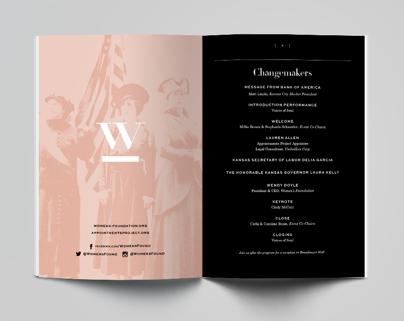 The Women’s Foundation is a Kansas City-based organization that seeks to advance economic and civic leadership for women. They put on an annual event with a special guest speaker to help advance their cause and raise money. I directed and designed their 2019 annual event, producing digital ads, social media posts, print ads, billboards, emails, on-site banners, signage, an event program, and more. The theme was “Changemakers” and the special guest speaker was Cindy McCain.