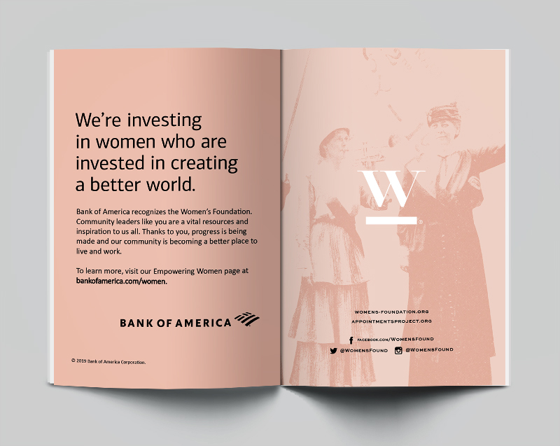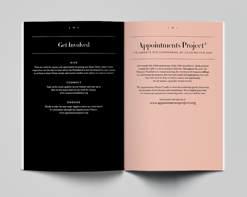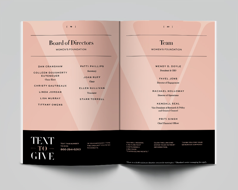 All event attendees received this 24-page program which includes a schedule, information about the Women’s Foundation and affiliated programs, sponsors, donation information, and advertising. The goal of my design was to create a layout that brings both the event’s graphics and the Women’s Foundation branding through every page, while keeping the message clear, clean, and easy-to-read.