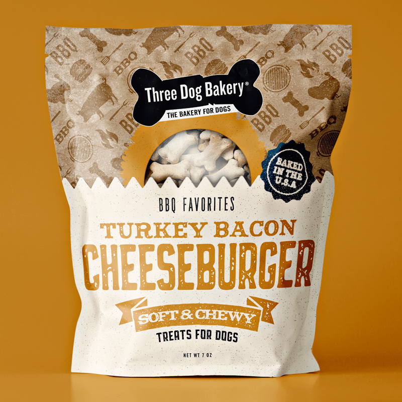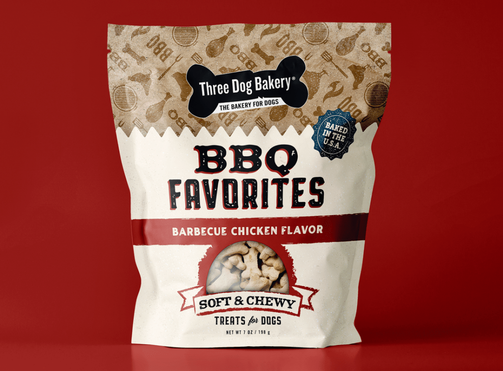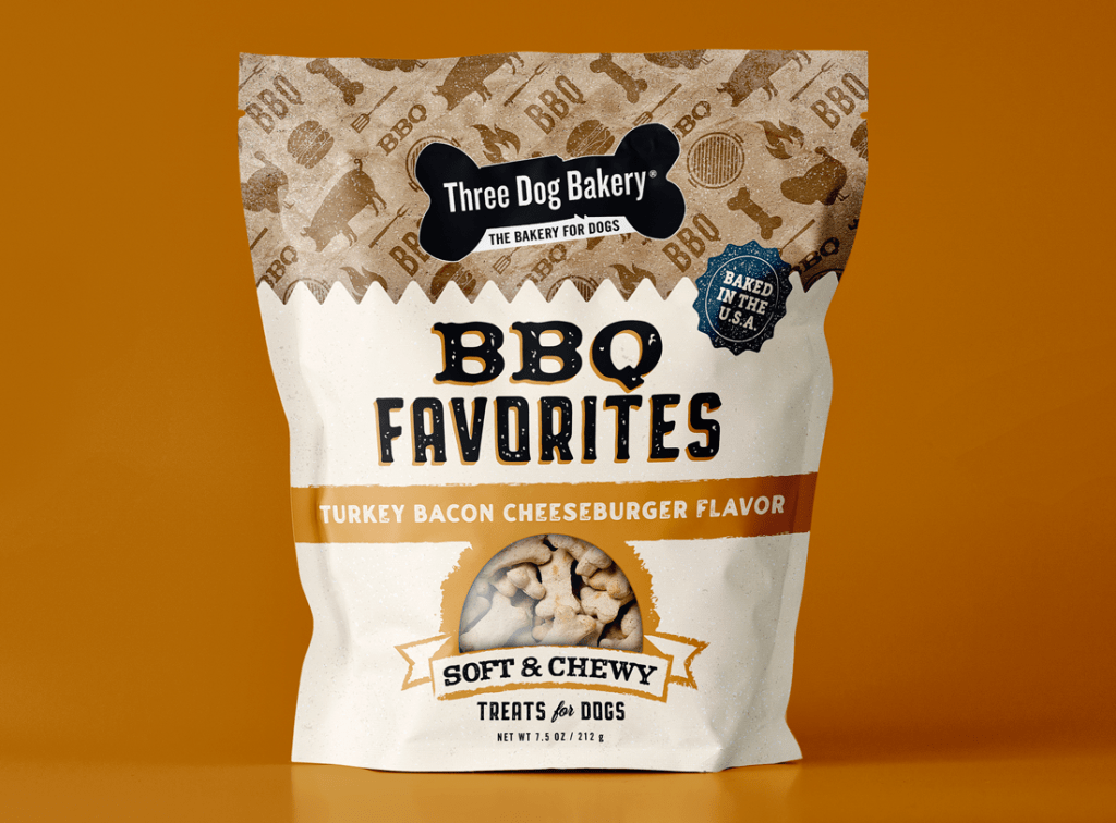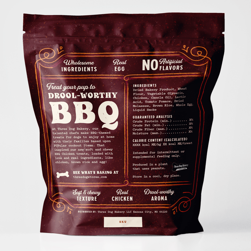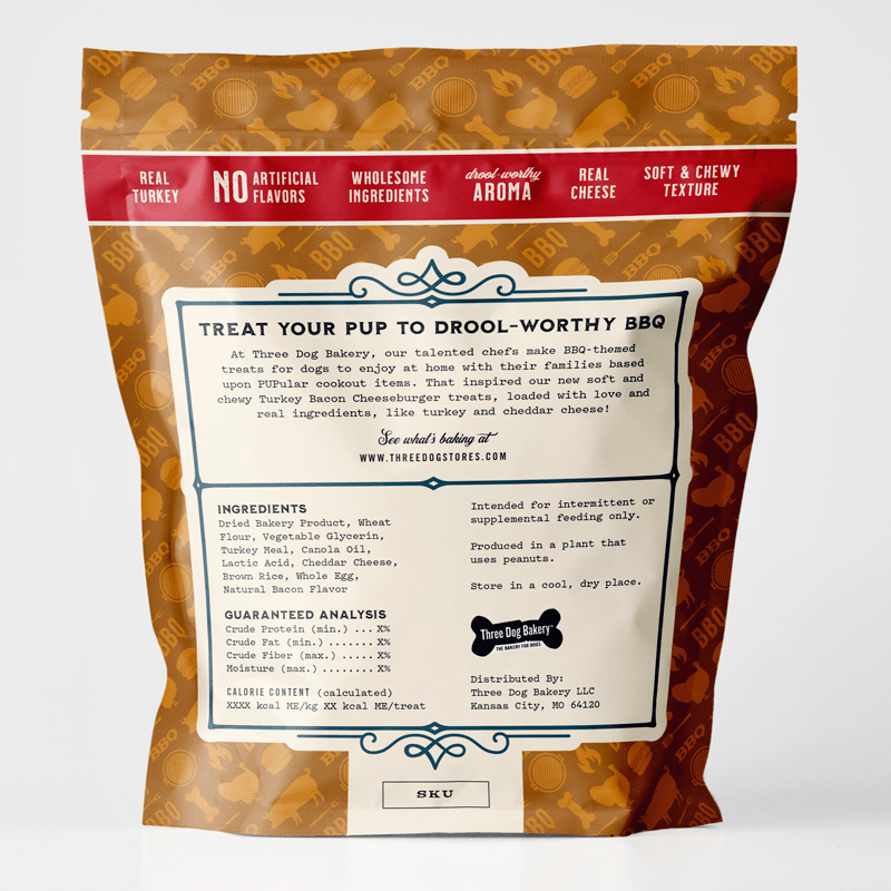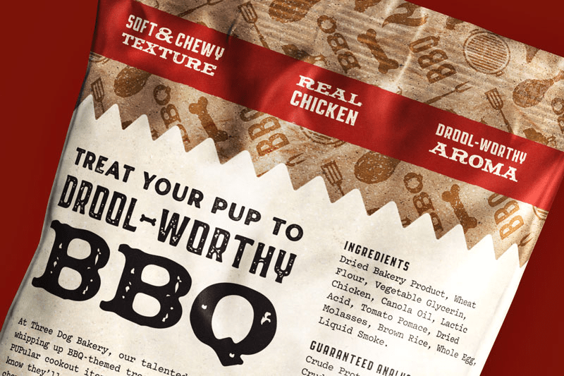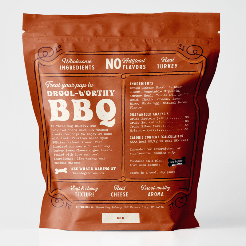 Three Dog Bakery creates dog treats using simple, real ingredients, and a slow baking process to create tasty and nutritional treats for dogs. They wanted to introduce two barbecue treats to their line for the spring, summer, and fall months, Barbecue Chicken Flavor and Turkey Bacon Cheeseburger Flavor, and needed packaging design for each flavor.