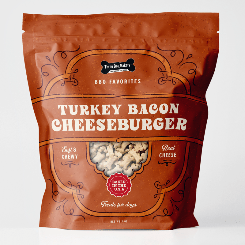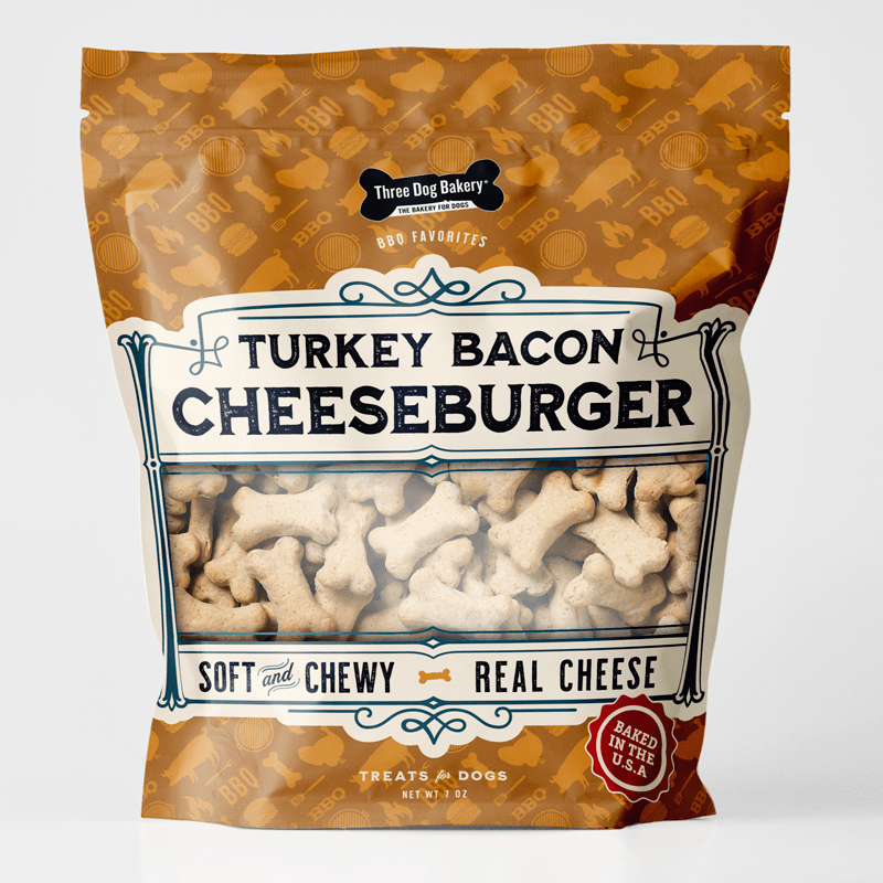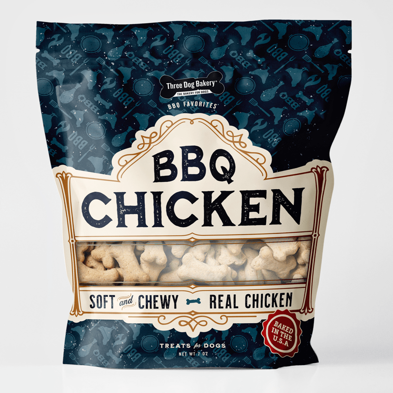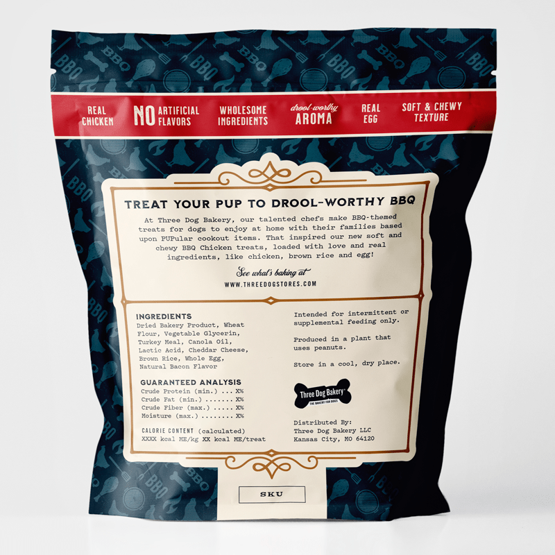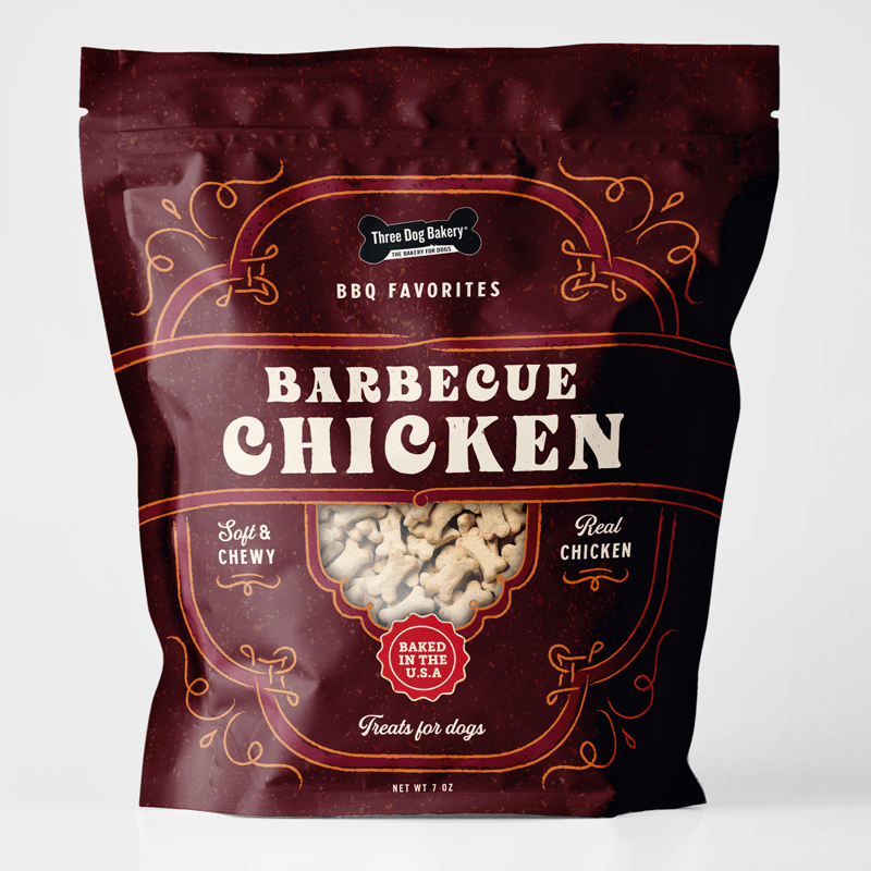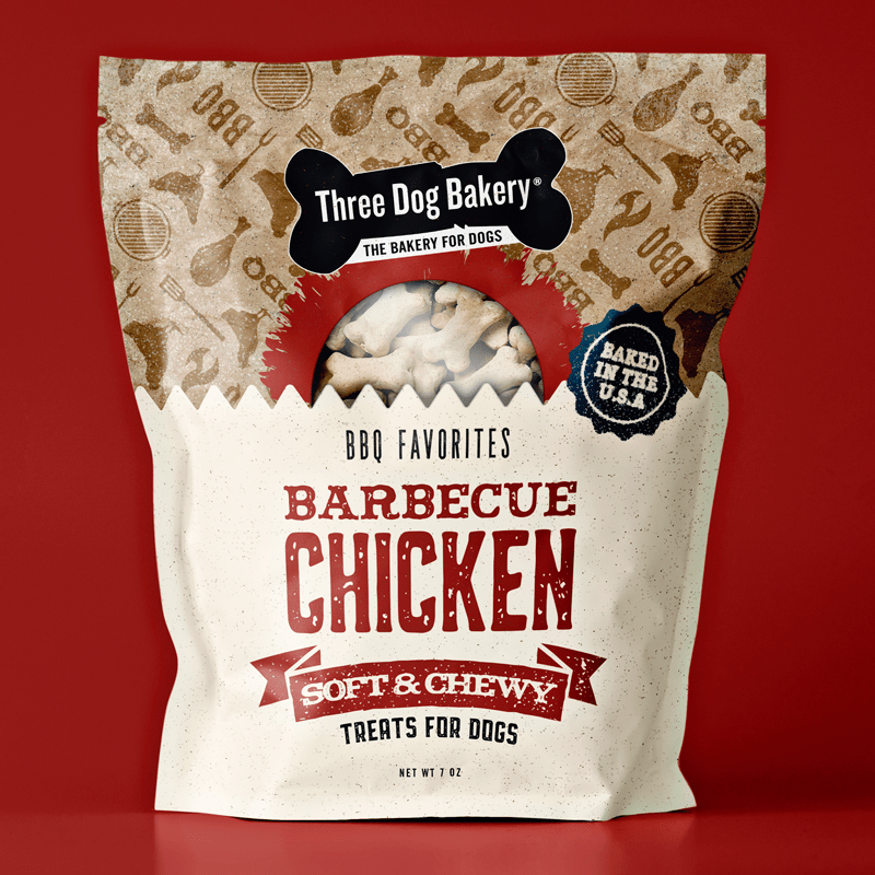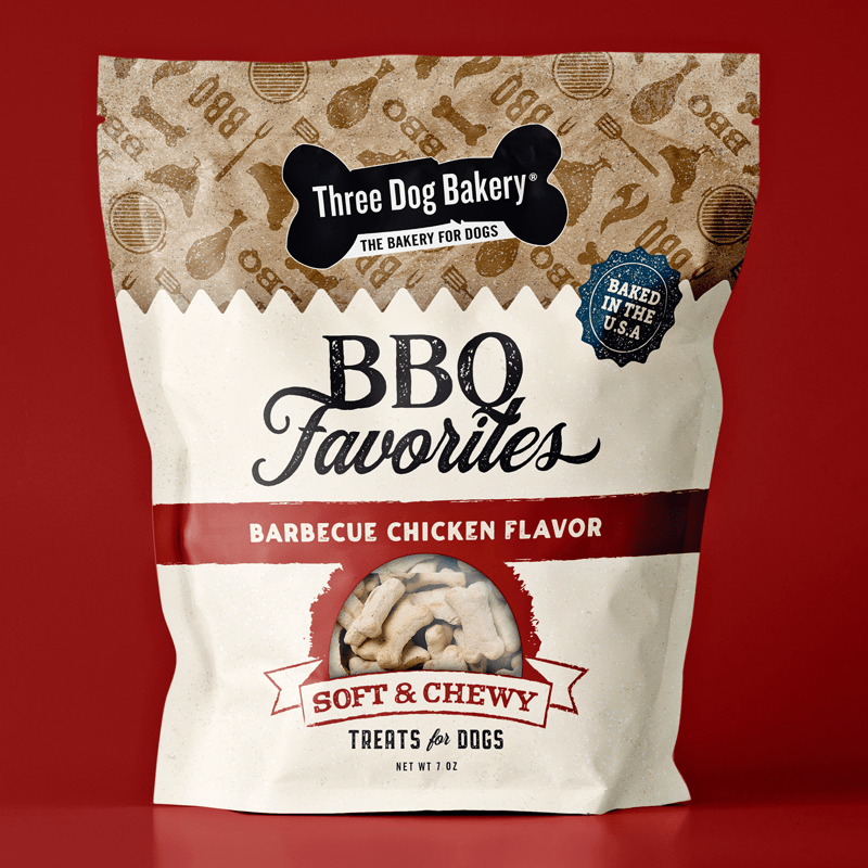 Three Dog Bakery creates dog treats using simple, real ingredients, and a slow baking process to create tasty and nutritional treats for dogs. They wanted to introduce two barbecue treats to their line for the spring, summer, and fall months, Barbecue Chicken Flavor and Turkey Bacon Cheeseburger Flavor, and needed packaging design for each flavor.