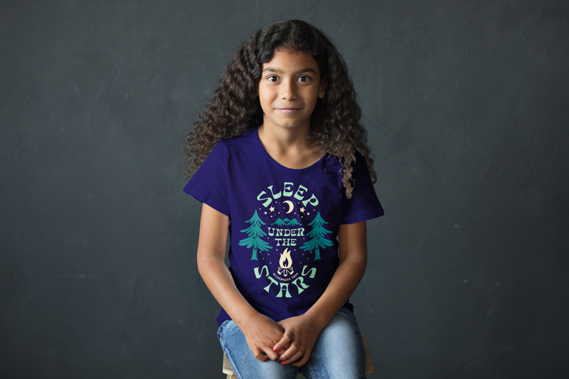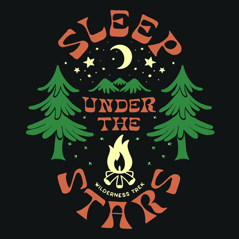A lot of the adventure-style design I saw liked to utilize badge shapes, so I laid out my illustrations and typography in an oval shape. This “Sleep Under the Stars” concept used 3 inks, depicts a night sky, distant mountains, trees, a campfire, and lightning bugs.