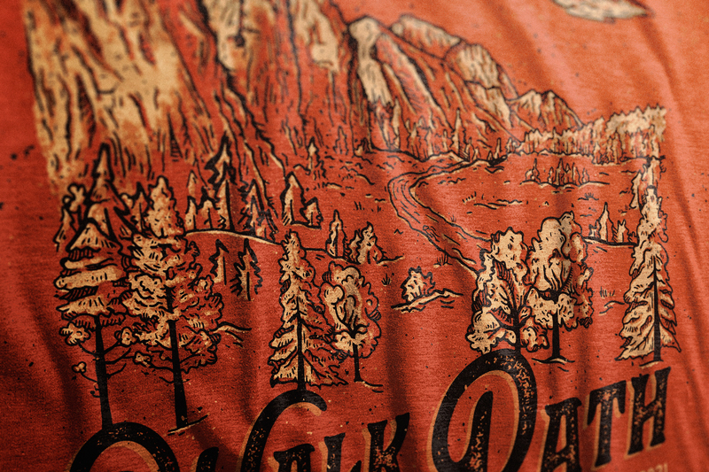 The third t-shirt was a nice generic audience t-shirt featuring a sunset. Illustrated in Procreate and finished with halftone textures in Adobe Illustrator, this illustration mimics a popular style from the 1970s with an illustration masked in a circle. It depicts a sun setting over a series of 3 levels of mountain range, with trees in the foreground that interact slightly with the hand-lettered “Wilderness Trek”.